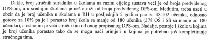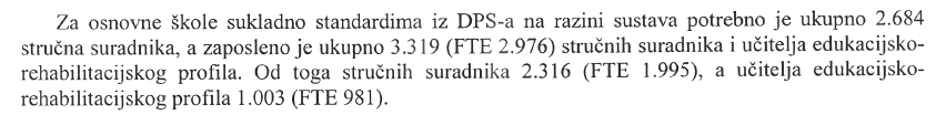 - 229 osnovnih škola s više od 500 učenika moralo bi sukladno DPS-u zapošljavati 916 stručnih suradnika (229 x 4 = 916).