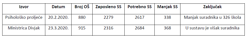 Tablica 1. Procjene Psihološkog proljeća, MZO-a i ministrice Divjak o broju potrebnih i broju zaposlenih stručnih suradnika u osnovnoškolskom sustavu RH na temelju DPS-a