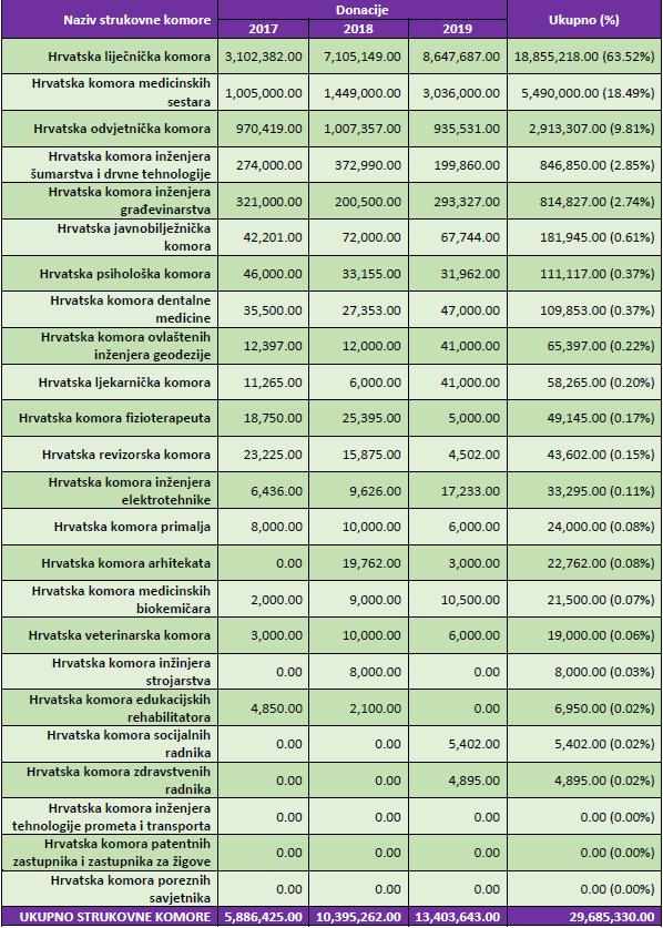 Tijekom 2017., 2018. i 2019. godine, 24 strukovne komore su donirale ukupno 29.7 milijuna kuna: HLK 18.9 milijuna, HKMS 5.5 milijuna, HOK 2.9 milijuna, a preostalih 21 komora zajedno 2.4 milijuna kuna.