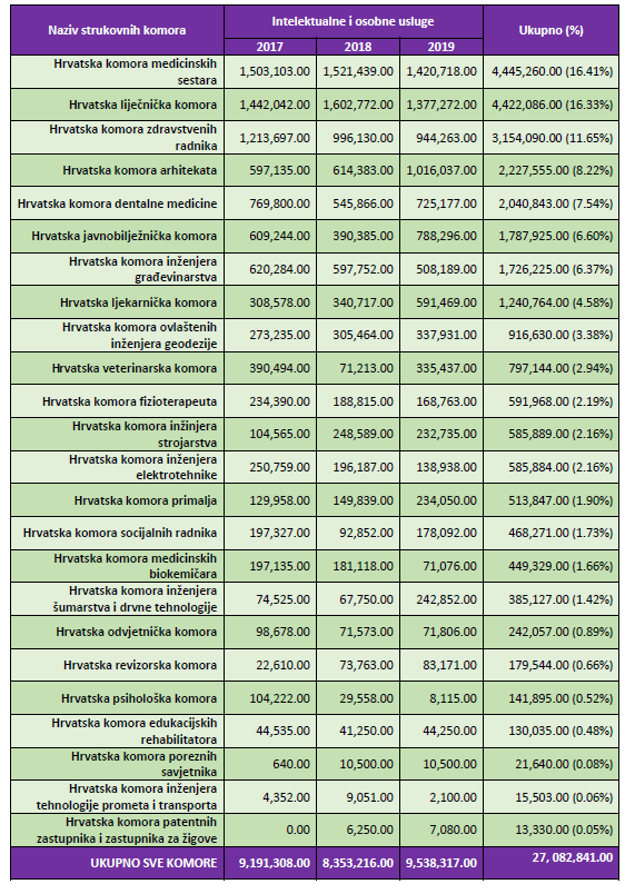 Tablica 2. Rashodi za intelektualne i osobne usluge strukovnih komora u razdoblju od 2017. do 2019. godine