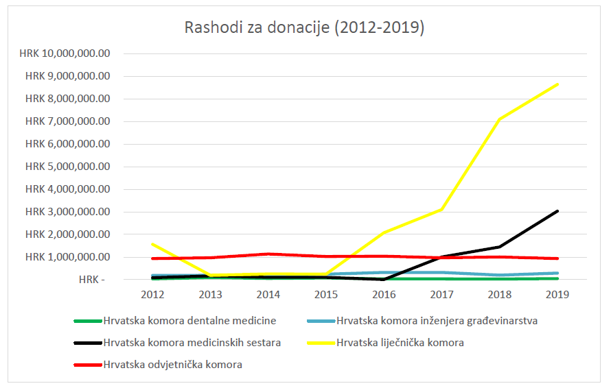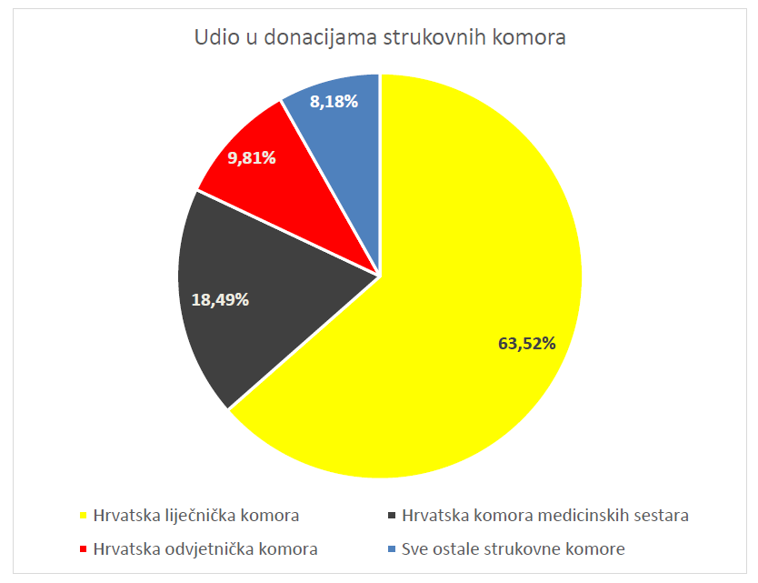 Najveći donator među svim komorama u posljednje tri godine je HLK. Ova komora je 2017. godine donirala 3,1 milijuna kuna, 2018. godine 7,1 milijuna kuna, a 2019. godine 8,6 milijuna kuna. Na drugom mjestu dobročinitelja nalazi se HKMS. Ta je komora donirala 1,01 milijun kuna u 2017. godini, 1,45 milijuna u 2018. godini te 3,04 milijuna kuna u 2019. godini. Nakon te dvije komore slijedi HOK, čije donacije se kreću oko milijun kuna godišnje. Na kraju imamo Hrvatsku komoru inženjera građevinarstva (HKIG) koja godišnje donira u prosjeku 250 do 300 tisuća kuna, te Hrvatsku komoru dentalne medicine (HKDM) – niti 50 tisuća kuna godišnje.