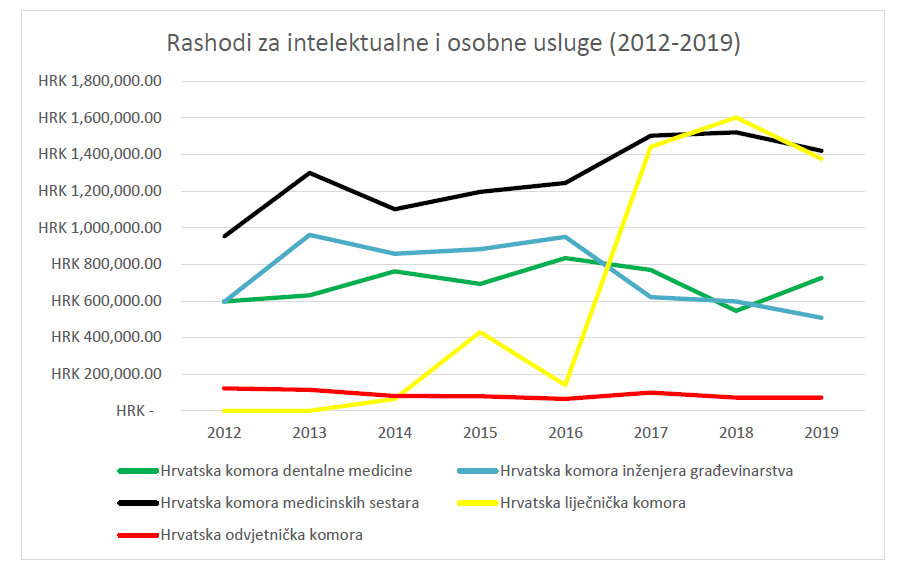 Na intelektualne usluge od 2012. godine uvjerljivo najviše troši HKMS, a od 2017. godine HLK s HKMS-om dijeli prvo mjesto. Ove dvije komore troše po milijun i pol kuna godišnje na intelektualne usluge, ali odbijaju dostaviti specifikaciju o primateljima njihovih uplata u tu svrhu.